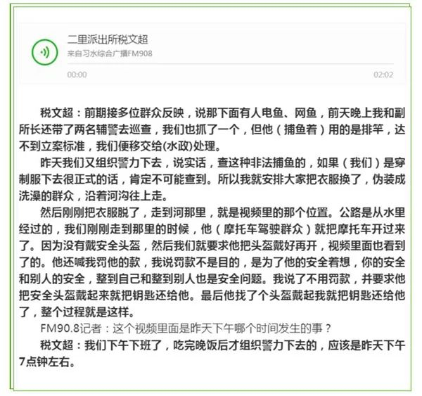 习水县公安局专人对该事件进行调查后发现,原来,泳裤执法男子实为二里镇派出所所长税文超,近日二里派出所多次接群众举报辖区马鹿河有人使用电击、网捕等方式非法捕鱼。