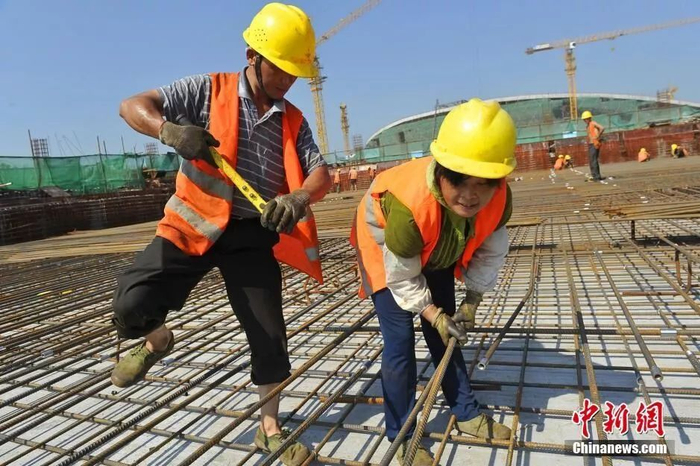 代高峡、余春莲夫妻俩在绑扎预制钢筋