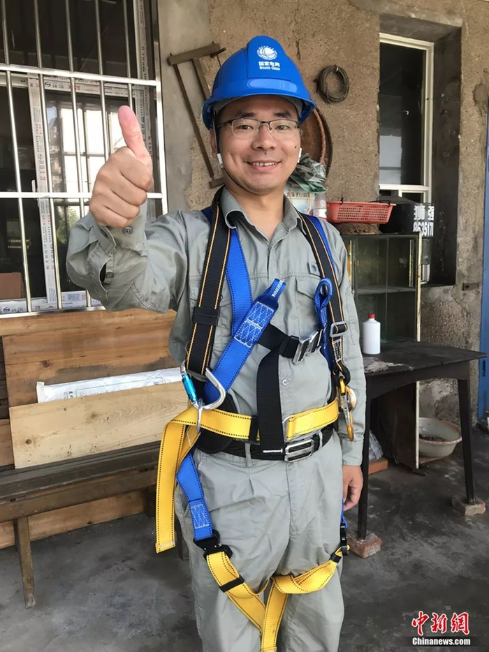 高压塔有70多米高,检修人员手脚并用,用半个小时左右的时间才能登上塔顶。