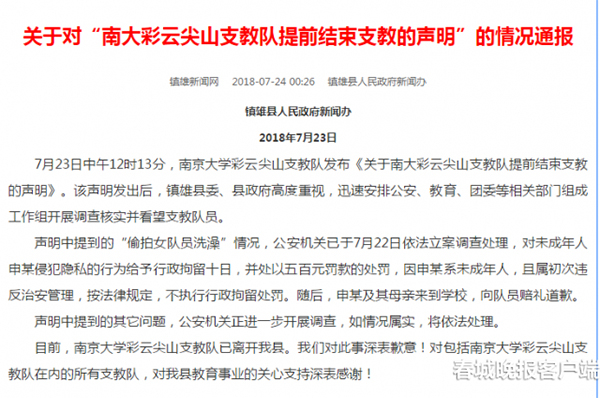 该《声明》内容简短而“劲爆”:自今年7月13日起,江苏南京大学彩云尖山 支教队(下称南大尖山 支教队)到云南昭通市镇雄县尖山乡尾坝村山顶小学执教以来,出现多起女队员被当地游民骚扰的事件,包括言语骚扰、行为骚扰、偷看换衣、偷内衣裤等,支教队还发现当地游民申某偷拍女队员洗澡,并将偷拍视频传播……