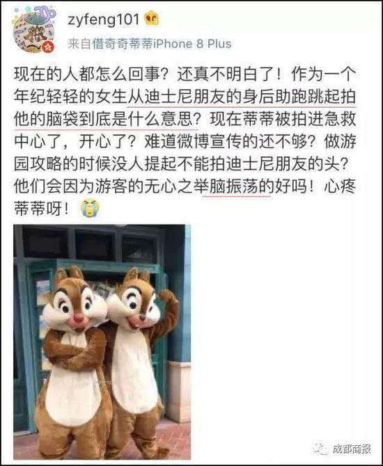 为什么游客拍打能造成头套内的演职人员受伤呢?有网友解释说:因为迪士尼头套里都是钢铁架,在肩膀上撑起来的,所以打头非常容易造成工作人员脑震荡等等。