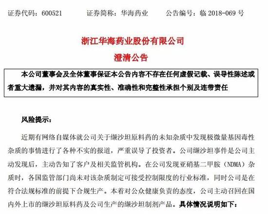 23日晚间,华海药业发布澄清公告,称近期网络报道存在不实,缬沙坦事件是公司主动发现后,主动告知了客户及相关监管机构,而且公司是在符合法规标准的前提下合规生产。