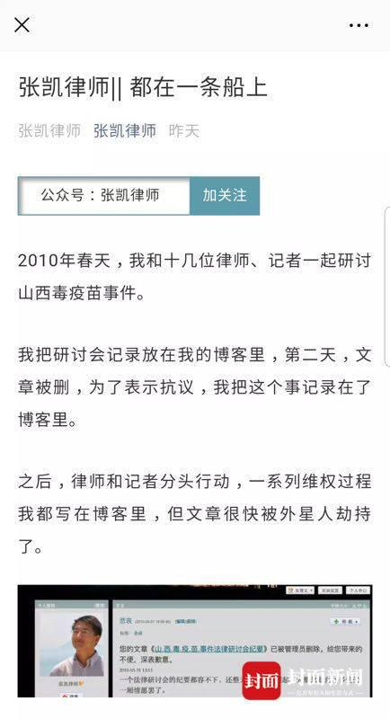 7月23日,文章作者张凯将文章《都在一条船上》发在公众号平台“张凯律师”发出后,文章主要讨论近日触动大众神经的疫苗风波,阅读量很快超过10万+。