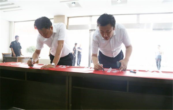 工作人员在条幅上签名。
