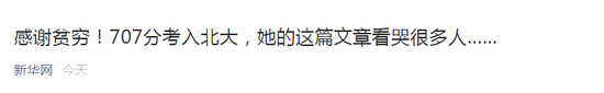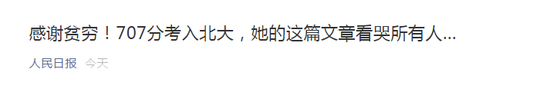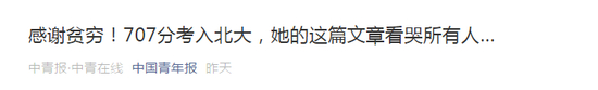 昨天河北青年报报道了河北女孩王心仪的事迹,《河北一寒门女孩707分考入北大!她写的“感谢贫穷”一文看哭了所有人……》受到了全国关注:人民日报等媒体都转发了报道,全国人民都在为她点赞!