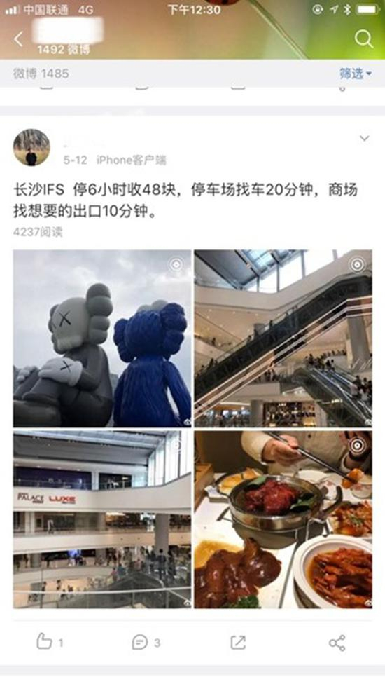 新湖南客户端记者在国金中心开业时亲身体验过,但因为消费“不达标”无法享受免费停车服务,最终停车6个多小时,收费48元。更令人懊恼的是,“地下停车场信号较弱,寻车服务也并没什么用,找车就花了20多分钟。”当是还发微博感慨了一番↓
