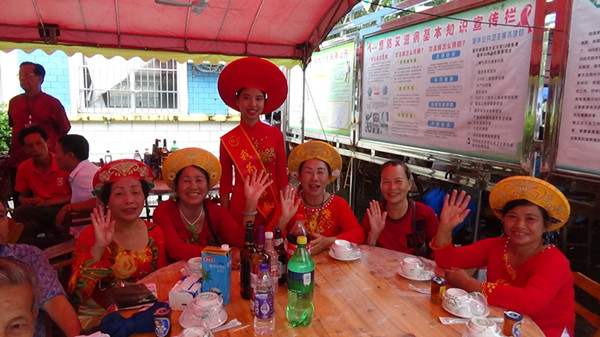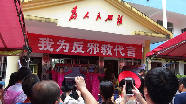 图为京族妇女为反邪教代言载歌载舞,观众鼓掌称好。