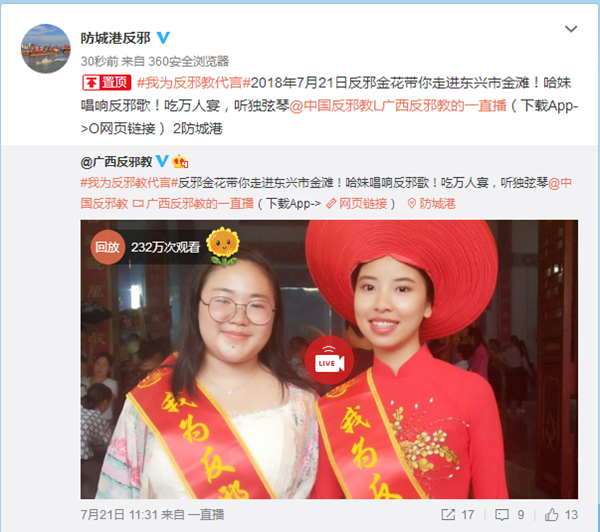 图为“我为反邪教代言”京族京花与反邪教金花互动直播截图。
