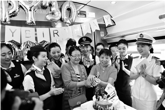 | 乘客和铁路工作人员切蛋糕为“西子号”庆生。 |