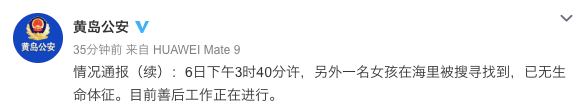 8月6日15时40分许,另外一名女孩在海里被搜寻找到,已无生命体征。