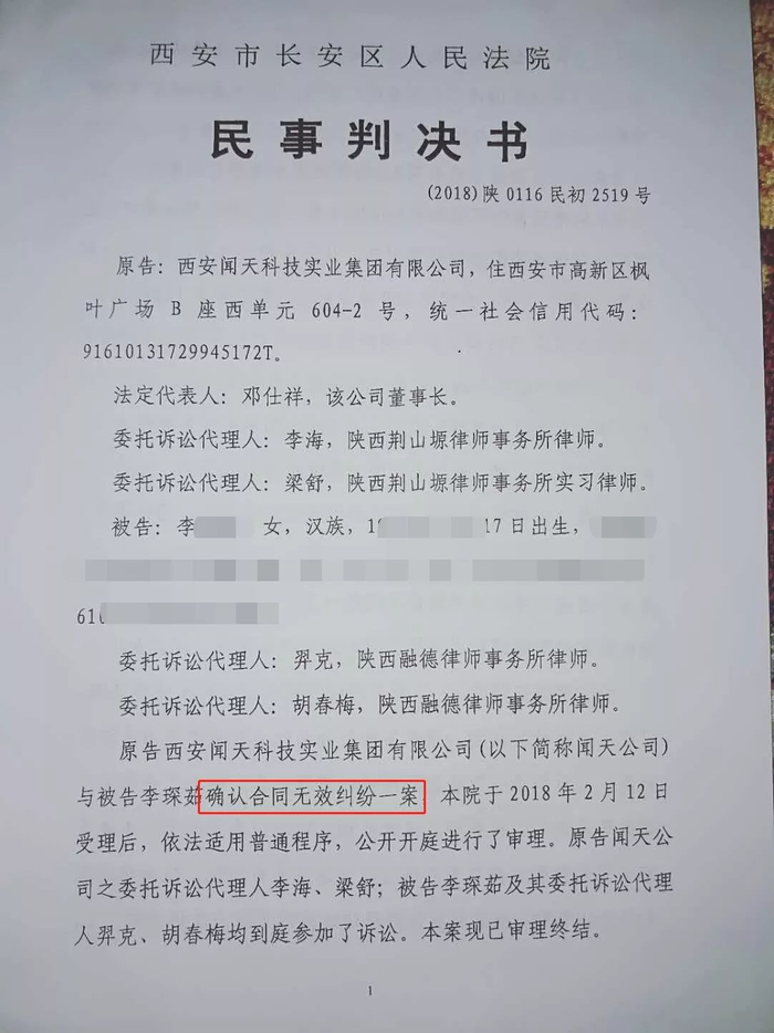 8月6日,澎湃新闻获悉,今年4月2日,被起诉业主之一李女士与闻天科技确认合同无效纠纷一案,已在西安市长安区人民法院开庭审理。6月8日,法院下达判决书,判决闻天科技与被告李女士签订的《紫衫庄园内部认购合同》无效。