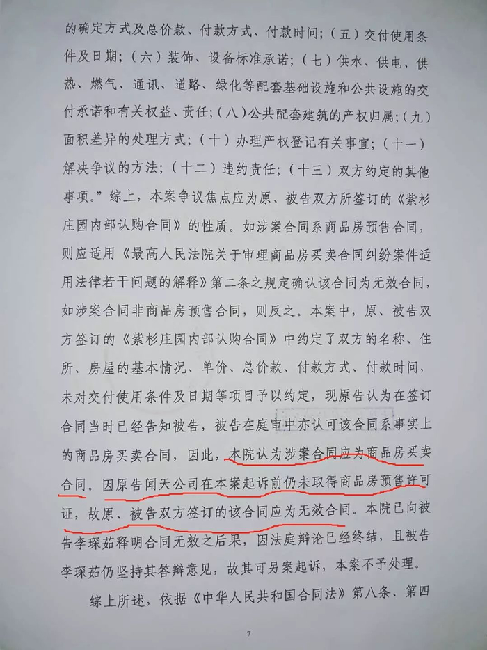 李女士向澎湃新闻提供的判决书显示,法院认为此案争议焦点应为原、被告双方所签订的《紫衫庄园内部认购合同》的性质,如涉案合同系商品房预售合同,则应适用《最高人民法院关于审理商品房买卖合同纠纷案件适用法律若干问题的解释》第二条之规定确认该合同为无效合同。