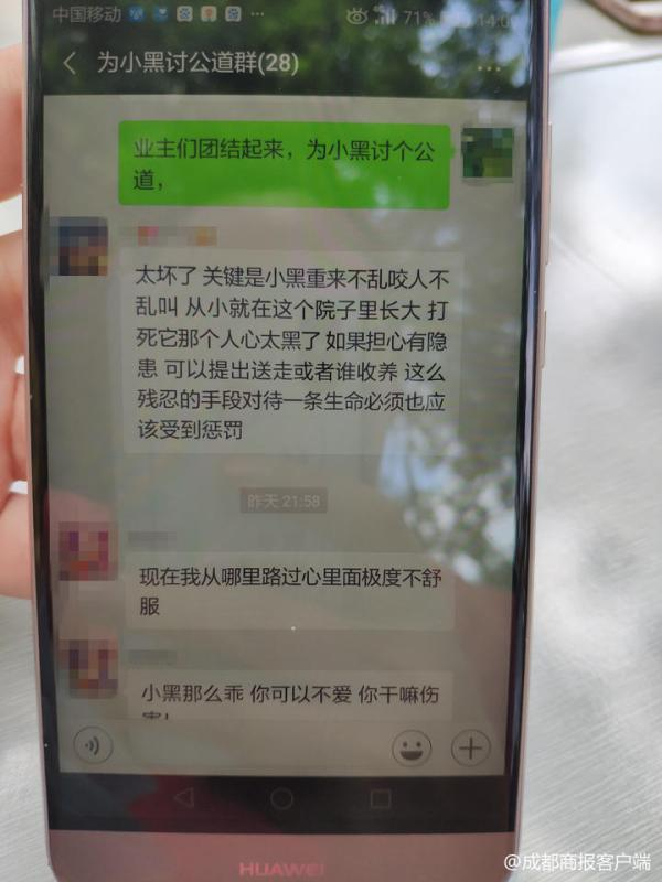 8日,因找不到打死小黑的人,也不知小黑的尸体在何处,气愤的业主建立“为小黑讨公道群”,并在小黑被打死的花坛处表达愤怒:“交出残害小黑凶手!否则拒缴物管费!”在树干上,还挂着一个小花圈,贴有小黑的照片:“我为何被乱棒打死”。