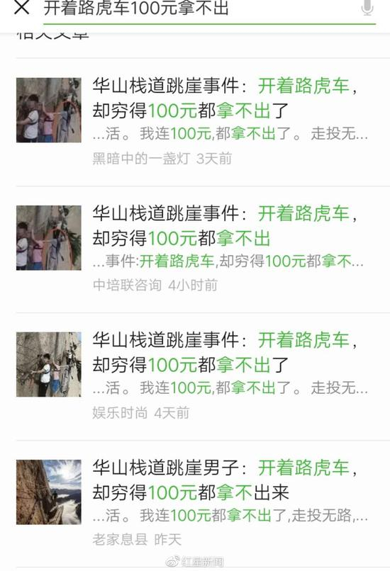 近日,有自媒体发消息称,华山栈道跳崖男子“开着路虎车,却穷得100元都拿不出”。红星新闻从华阴市公安局北峰派出所相关民警处获悉,此消息失实。