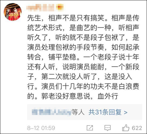 “文无第一,武无第二,艺术这个东西,只代表我此时此刻的看法,你认为你的公式相声好,对啊,存在就是合理的,我并不打击你,我也认同你,我只是告诉你,在这个舞台上,你那个,行不通。”