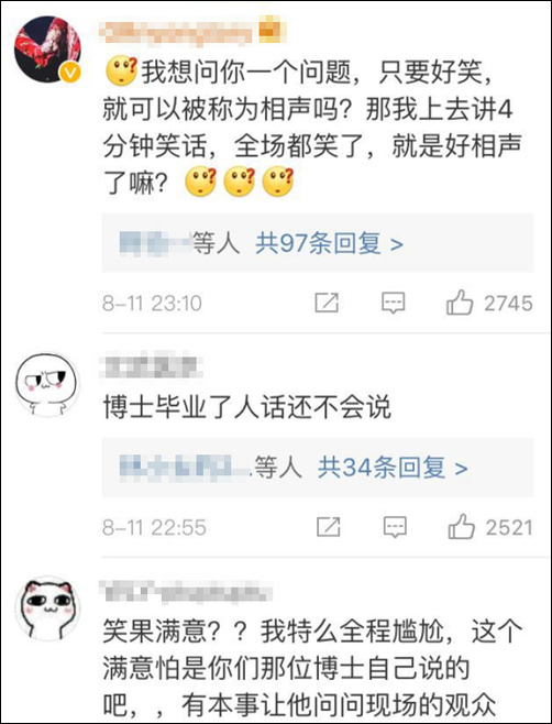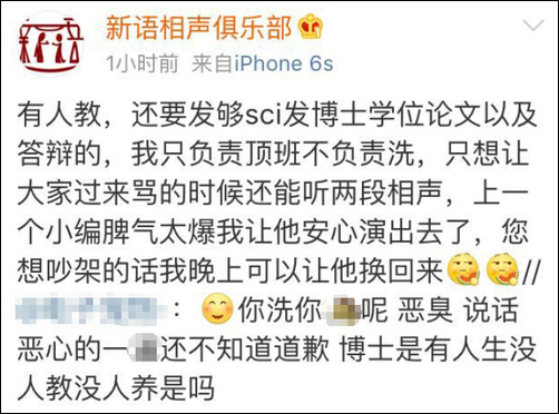 有网友认为他通篇说明没有一句道歉,非常偏激地指责他“有人生没人教”。没想到这句脏话竟被晒了出来,@新语相声俱乐部 回应说,“有人教,还要发够SCI博士学位论文以及答辩的”。