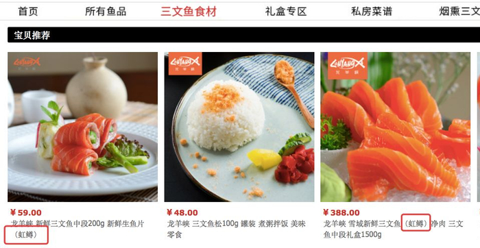 此前,在网购平台上,很多虹鳟鱼产品标注的是“三文鱼”字样,没有点明是“虹鳟”。