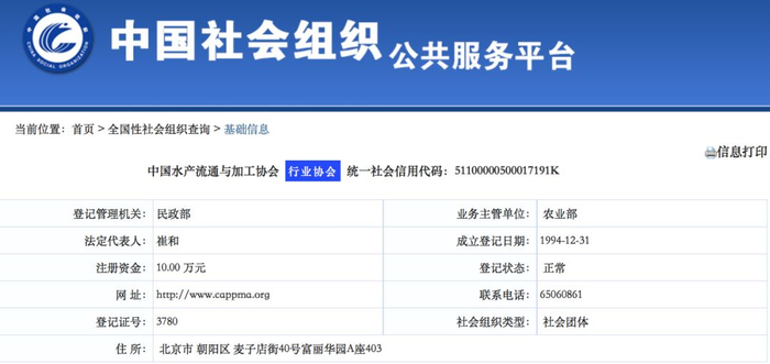 每经小编(微信号:nbdnews)在全国社会组织公告服务平台上查询到,中国水产流通与加工协会成立于1994年,而且是2015年的“全国先进社会组织”。