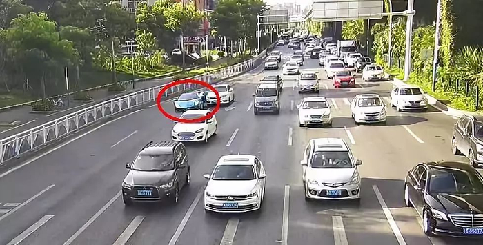 就在兰博基尼车身完全回正到车道上时,本田小车突然向右变道插了过来,一不小心撞上了兰博基尼的车尾。“砰”一声响后,兰博基尼向左来了个大漂移,撞上了长安,出现开头那一幕。