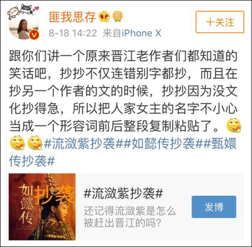 原标题:匪我思存连发微博斥《如懿传》抄袭:错别字都抄