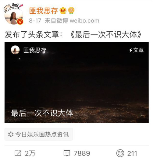 匪我思存表示,她自知无法与开播在即的《如懿传》背后数以千万的营销预算抗衡,也无意再替其增加热度和话题,因此将就此打住。(全文附于最后)
