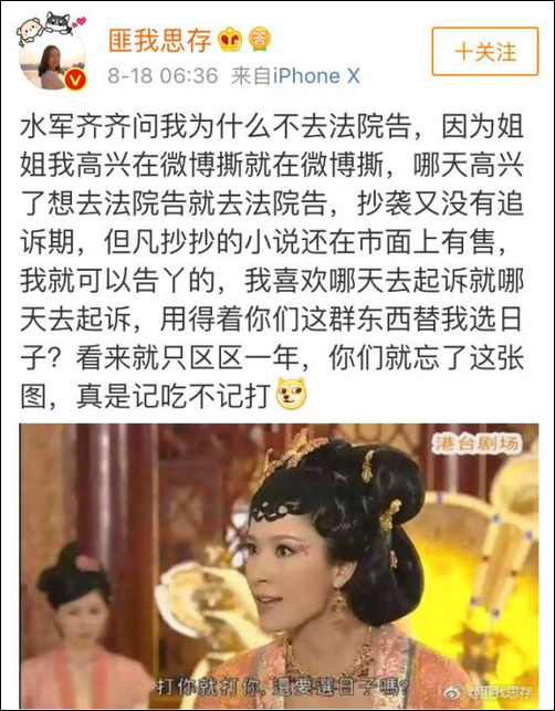 8月18日,匪我思存再一次发声抨击抄袭,讽刺流潋紫抄袭时“不仅连错别字都抄”,还在抄袭另一个作者时,把女主角的女子当成了形容词,前后整段复制粘贴。她直接回怼质疑她选择此时旧事重提的网友:“我喜欢哪天去起诉就哪天去起诉,用得着你们替我选日子?”