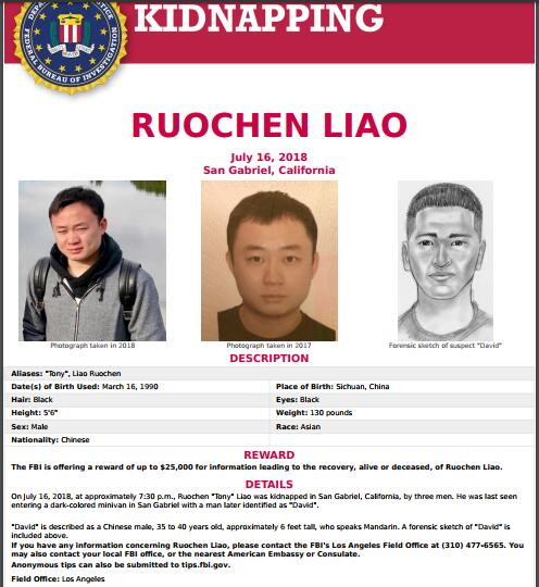 据FBI洛杉矶办公室发言人艾米勒(Laura Eimiller )介绍,这名被绑架的男性名为廖若晨(音译,Tony Liao Ruochen),现年28岁,在科斯塔梅萨(加州南部城市)一家豪华车经销商任职。7月16日,廖若晨在圣盖博市被3名乘坐两辆黑色汽车的男子绑架。