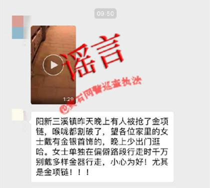 8月17日,湖北省黄石市公安局网安支队通过官方平台发布了辟谣声明,称微信群内近日流传一段时长为1分29秒的视频,传言称三溪镇一名女子因被抢金项链而遭割喉,家里有女士戴金银饰品的,晚上不要出门逛,注意安全。经网警部门核实,黄石暂未接到相关警情,该视频并非发生在本地。