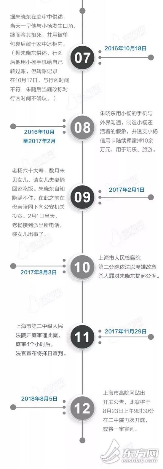2016年10月18日,朱晓东在位于虹口区的家中与妻子杨俪萍发生争吵,后朱晓东用双手扼住杨俪萍颈部致其机械性窒息死亡。随后,朱晓东将妻子的尸体藏于冰柜内。在之后的三个多月内,朱晓东冒充杨俪萍,通过微信与亡妻的家人和朋友联系。