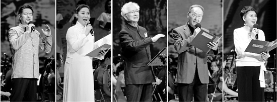 开场,一曲恢弘大气的《赠薛校书》合唱过后,我国第一代电视工作者、著名朗诵艺术家陈铎,手持折扇,款款上台。“若教月下乘舟去,何啻风流到剡溪”,他朗诵了李白的《别储邕之剡中》《鲁东门泛舟》《秋下荆门》,这个经典的男声,再现了李白对剡溪的倾情赞颂。
