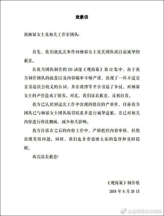 8月29日,3D动漫《观海策》通过@观海策官方微博 就最新播出的第12集动漫中,关于影射“杨幂脚臭”的台词和内容,向杨幂致歉。