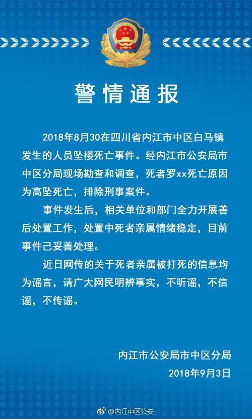 原标题:四川内江一人坠楼后亲属被打死?警方:谣言