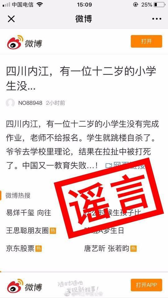与此同时,网络上也出现了“内江白马听说一个学生作业没写好去报名,老师不给报,就从楼上跳下去摔死了”、“四川内江,有一位12岁的小学生没有完成作业,老师不给报名,学生就跳楼自杀了,爷爷去学校里理论,结果在拉扯中被打死了”等未经证实的言论。