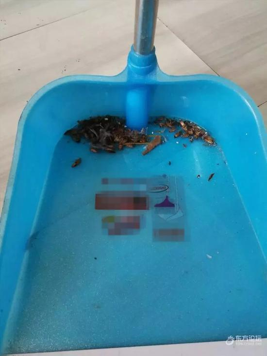 7月28日,两女生打电话过来,说房子不续租,在一系列押金啊、水电费什么的清算之后,觉得房间地面看上还干净,直接让两女生搬走了。没想到,第二天去清扫的时候,一打开柜子门,发现到处是蟑螂在爬。房东夫妇俩从晚上七点忙到十一点,拍死了150多只蟑螂,临走的时候喷了杀虫剂,第二天发现还有100多只死蟑螂,接下来的几天,每天都断断续续扫出很多…