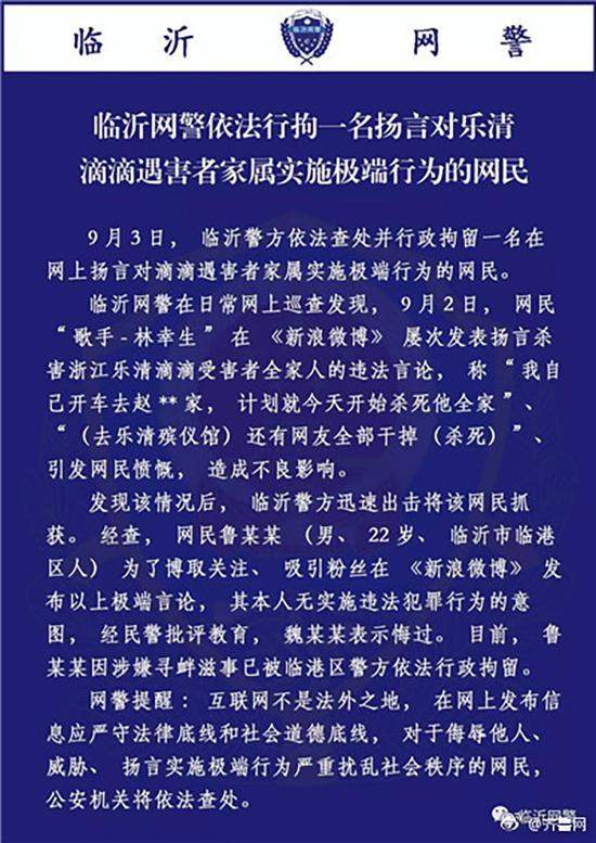 临沂市公安局网络安全保卫支队微博9月4日消息,9月3日,临沂警方依法查处并行政拘留一名在网上扬言对滴滴遇害者家属实施极端行为的网民。