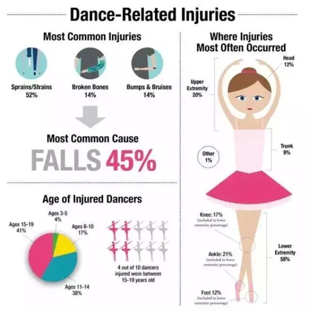 美国nationwidechildrens网站曾发布过一个3-19岁孩子跳舞受伤的调查,调查结果发现孩子最容易受伤的部位及形式大概如下: