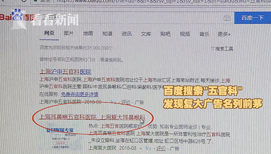 换一下关键词,搜索“五官科”,或者“五官科医院”,复大的广告依然名列前茅,网页标题为“上海耳鼻喉五官科医院”。名副其实的复旦附属五官科医院倒是排在了第五位。
