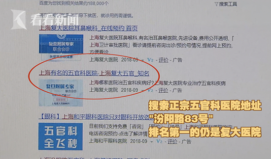同样遇上糟心事的还有来自宁波的小周,她想去复旦附属眼耳鼻喉科医院看鼻炎,但通过百度查了几次,跳出来的都是复大医院。网络预约后,很快就有客服联系她,对于是否是复旦大学附属五官科医院的疑问,对方也吹得头头是道。