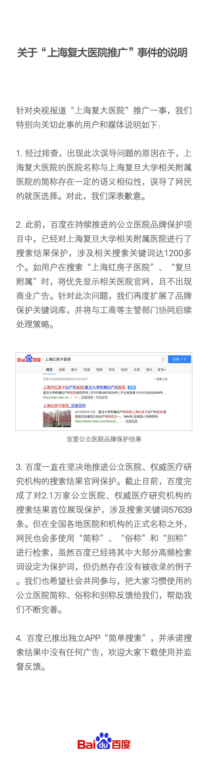百度回应复大医院推广事件:扩展品牌保护关键词库 澎湃新闻 澎湃新闻官方账号 2018.09.0911:04 关注 原标题:百度回应复大医院推广事件:将扩展品牌保护关键词库 @百度9月9日消息,针对央视报道“上海复大医院”推广一事,我们特别向关切此事的用户和媒体说明如下: