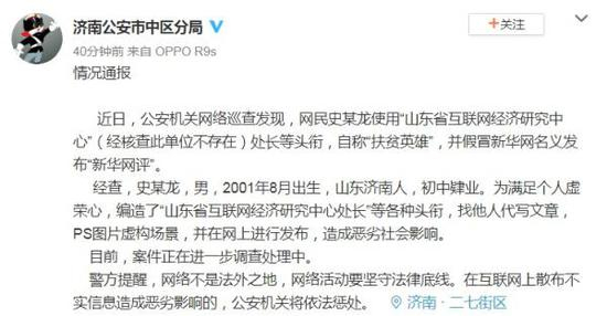 原标题:济南警方通报:网民史某龙满足虚荣心编造头衔,造成恶劣影响