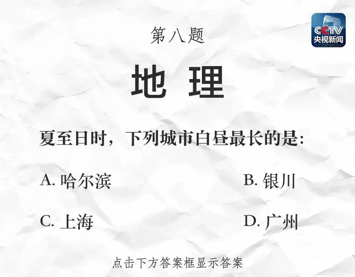 夏至日,太阳几乎直射北回归线,北半球纬度越高的地方,白昼越长。地理位置上,哈尔滨位置最靠北,白昼自然最长