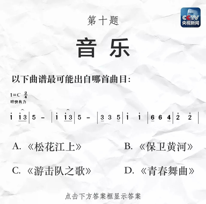 这段旋律出自冼星海《黄河大合唱》的第七乐章《保卫黄河》。曲目写成于抗日战争时期,在军民中广为传播。学生时代,很多同学甚至连五线谱都识得很“溜”。如今,看到简谱,你是否还能迅速地反应出来对应歌曲呢?
