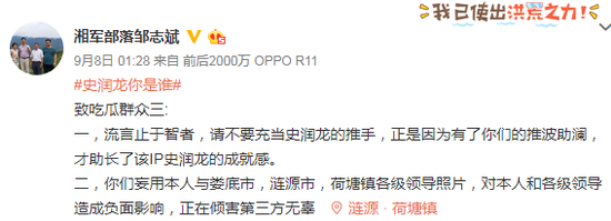 他帮史润龙微博认证 自称完全不认识怀疑被盗号