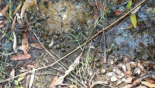 ▲桃子湖边,大量福寿螺出现。