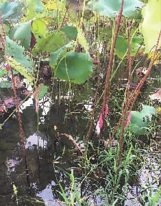 ▲福寿螺卵在荷叶杆上聚集成块。 见习记者 石芳宇 摄