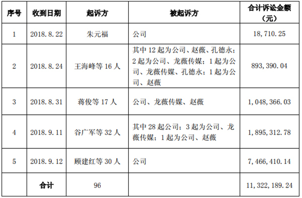 自 2018 年 6 月 20 日、2018 年 7 月 26 日、2018 年 8 月 16 日以及公司 2018年半年报中披露的诉讼案件后,截至 2018 年 9 月 13 日,浙江祥源文化股份有限公司(以下简称“本公司”或“公司”)陆续收到法院《应诉通知书》,涉及 96起证券虚假陈述责任纠纷案件,诉讼金额共计人民币 11,322,189.24 元,达到上海证券交易所股票上市规则规定的披露标准。上述案件均由杭州市中级人民法院受理,基本情况如下;