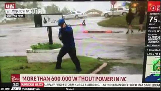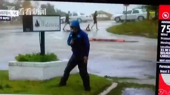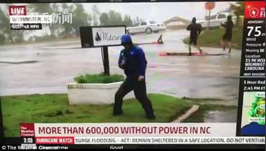 当天上午,天气频道记者迈克·赛德尔站在飓风过境后的威明顿街头做一档直播连线,介绍飓风已造成当地60万用户断电的现实状况。为了营造飓风肆虐的更佳效果,迈克记者岔开腿歪斜站立在路中间的绿化地带,蜷缩头颈,佝偻着背,好像一旦伸直身体就会被风吹倒似的。