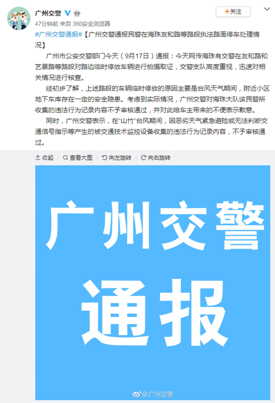 经初步了解,上述路段的车辆临时停放的原因主要是台风天气期间,附近小区地下车库存在一定的安全隐患。考虑到实际情况,广州交警对海珠大队该民警所收集的违法行为记录内容不予审核通过,并对此给车主带来的不便表示歉意。