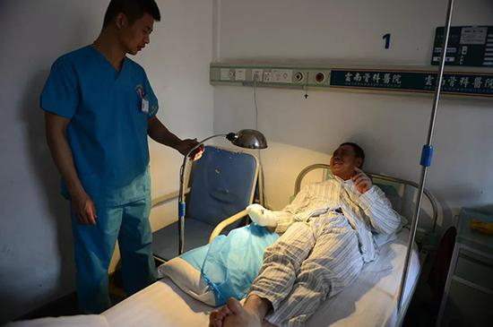 18日下午,记者在云南骨科医院见到了躺在病床上,且神采奕奕的杨师傅。杨师傅受伤的手,经过修复重建手术,血液循环良好,正在烤着烤灯。