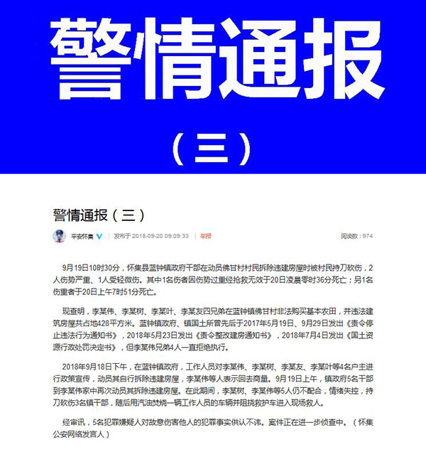 原标题:广东怀集警方:干部动员拆违被村民砍杀,2伤重者已死亡